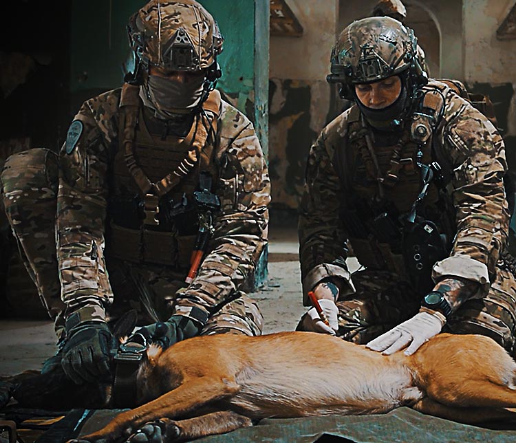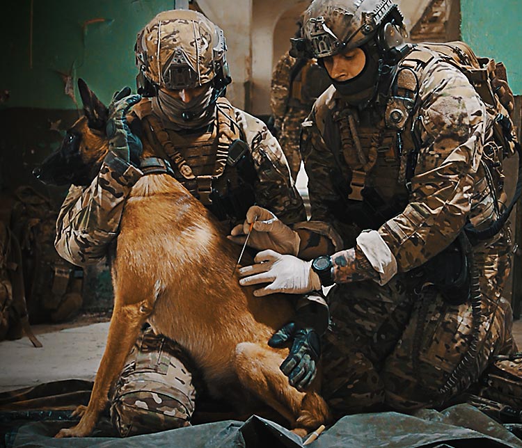 Canine Tactical Casualty Care is in principle the same as for humans. The goals are simple. Complete the mission, prevent additional casualties & aid the downed K9 buddy.
